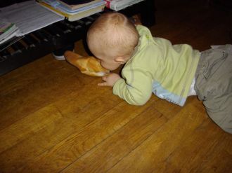 et l'autre jour, il a réussi a attrapé la baguette de pain sur la table basse... et il était tout content de pouvoir en manger!
