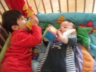 donc Michael de retour dans son parc mordant à pleine dent dans les jouets de Nathan pour lui montrer comment bien faire , le bon geste technique de la prise de jouet , le positionnement du poignet ! tout un art fort amusant à voir....