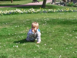 J'adore découvrir la nature, marcher dans l'herbe, cueillir des paquerettes que je mange, tondre la pelouse, faire des coucou aux canards, faire du tobogan...